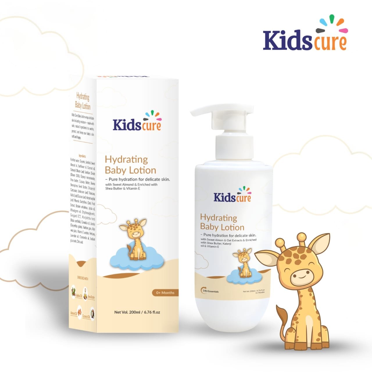 Kidscure Hydrating Baby Lotion is thoughtfully formulated to provide deep, long-lasting moisture for your baby’s delicate skin. Enriched with Sweet Almond Oil, Oat Extracts, Shea Butter, Kalonji Oil, and Vitamin E, this gentle lotion nourishes, soothes, and protects against dryness. Its lightweight, non-sticky texture absorbs quickly, leaving skin soft, smooth, and comfortably hydrated all day. Free from harsh chemicals and safe for everyday use, it’s the perfect touch of care after every bath.